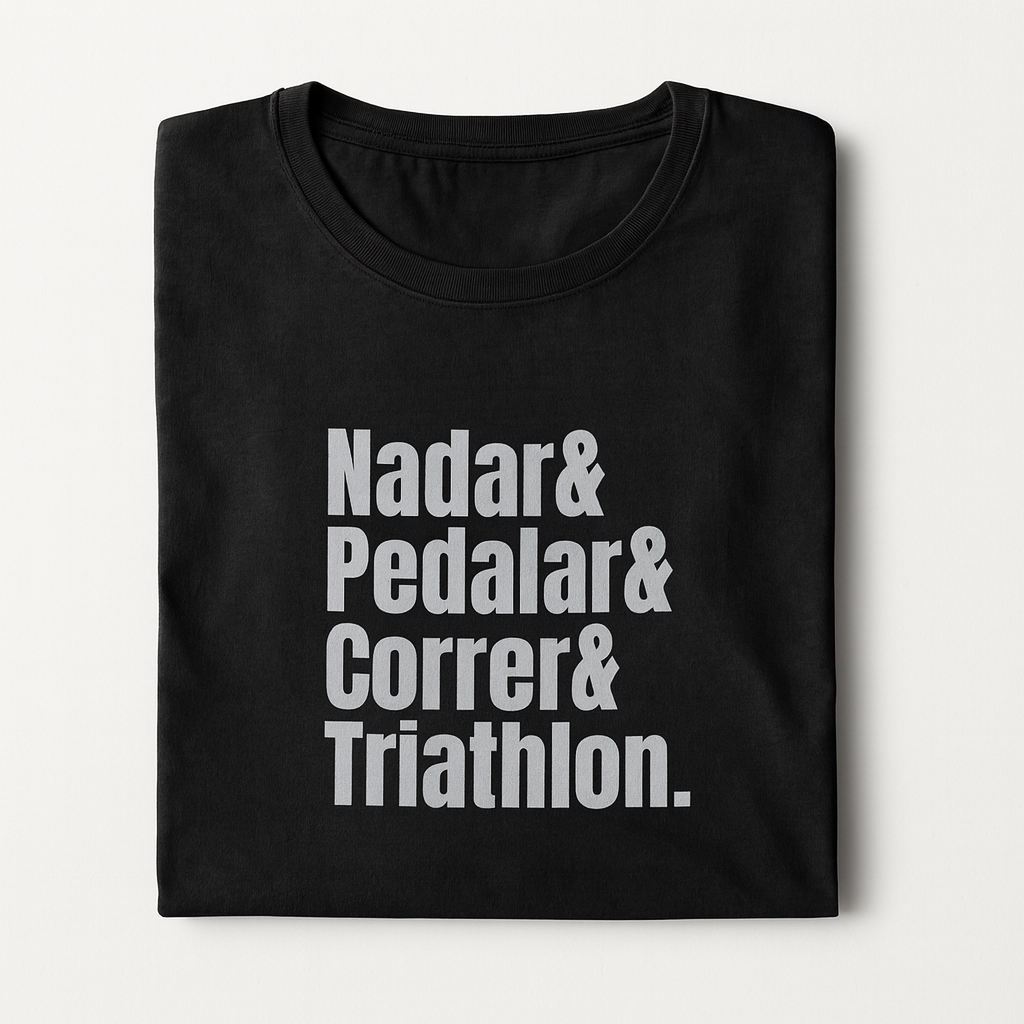 Camiseta minimalista com tipografia marcante destacando as etapas do Triathlon: Nadar, Pedalar e Correr. Design clean, moderno e perfeito para quem vive o espírito do endurance.