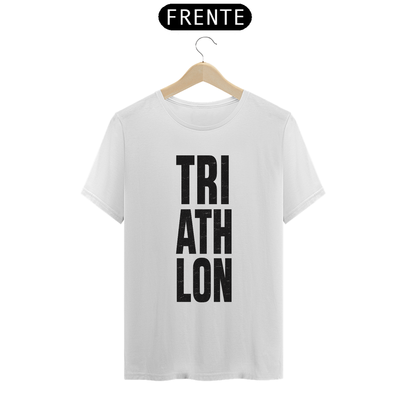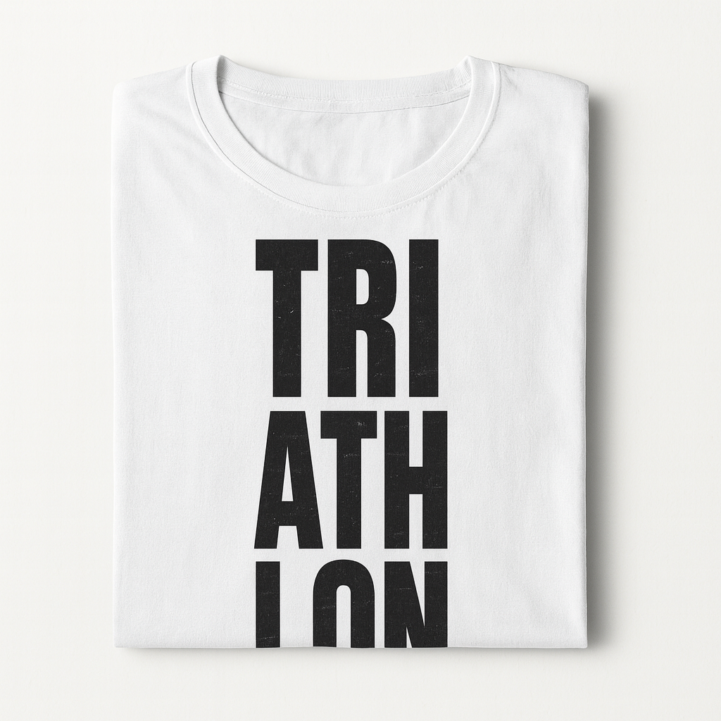 Estampa tipográfica vertical com a palavra TRIATHLON dividida em três linhas (TRI / ATH / LON), criada em fonte bold e condensada, com textura grunge desgastada que transmite movimento, força e estilo esportivo. Arte ideal para atletas de corrida, ciclismo e natação, trazendo visual moderno, urbano e de alta energia.