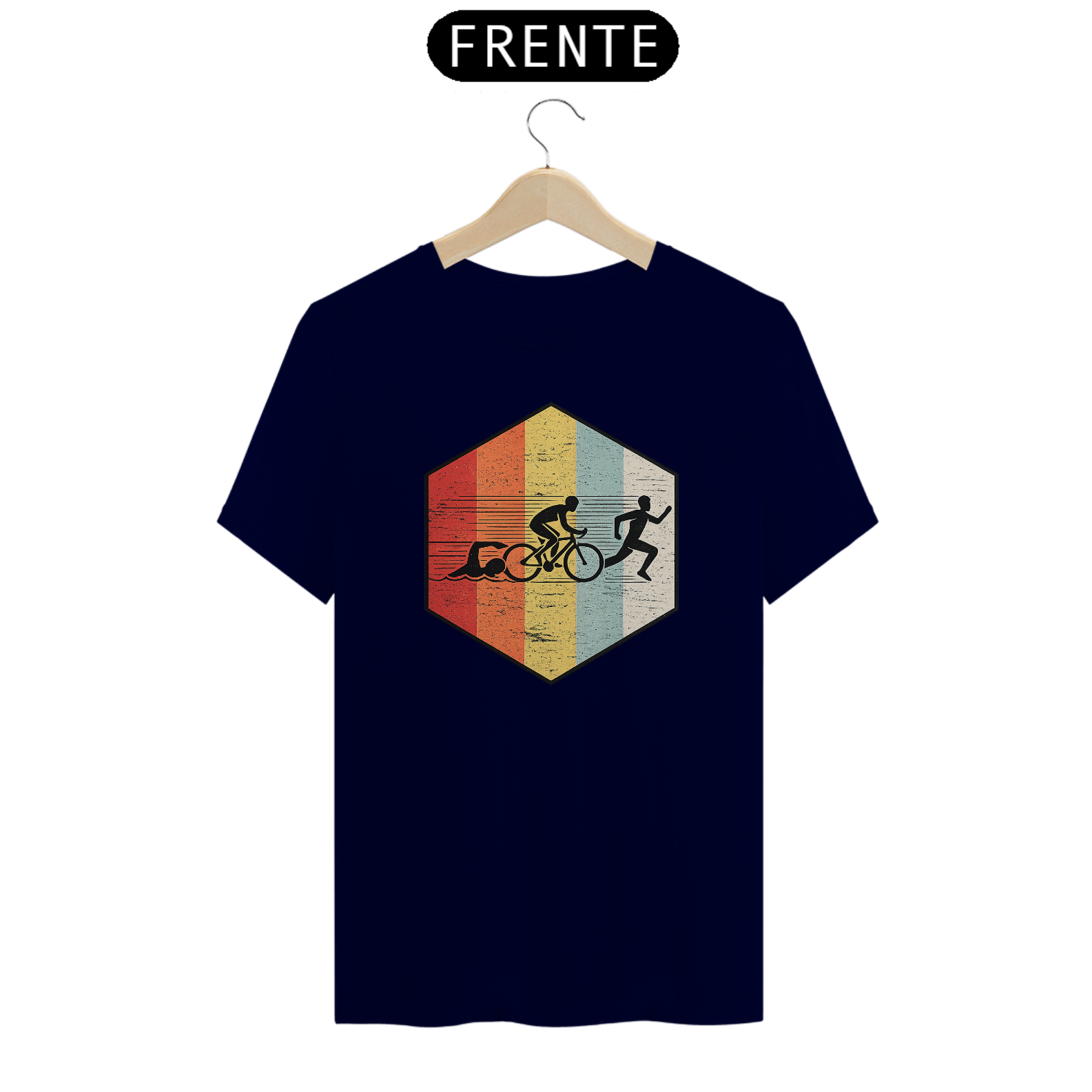 Uma estampa criada para quem vive o esporte como estilo de vida. O design apresenta um hexágono central com faixas verticais em cores retrô, trazendo silhuetas minimalistas que representam as três modalidades do triathlon: natação, ciclismo e corrida.